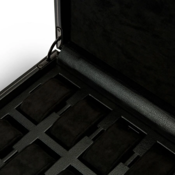 Klokkeboksen måler 26,7 × 22,9 × 10,4 cm og byr på plass til åtte klokker, hvor hver klokke ligger på hengende puter som beskytter lenkene mot friksjon og trykk. For ekstra sikkerhet lukkes boksen med lås og nøkkel, slik at dine mest verdifulle klokker oppbevares trygt. I tillegg er boksen utstyrt med en USB-port for smartklokker, som gjør det mulig å lade enheten mens den ligger godt beskyttet i interiøret.
