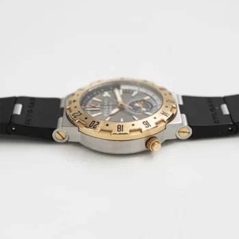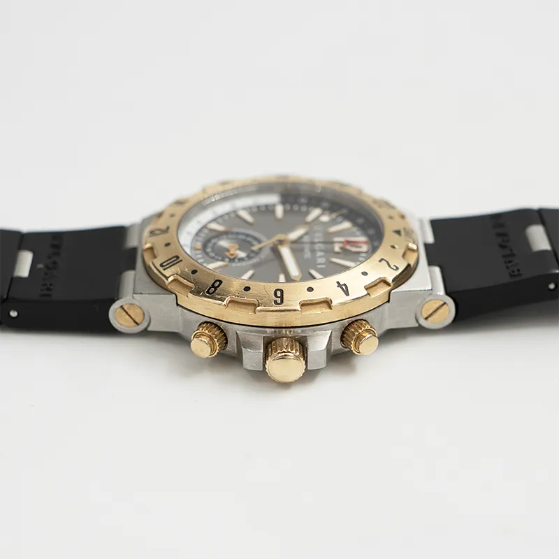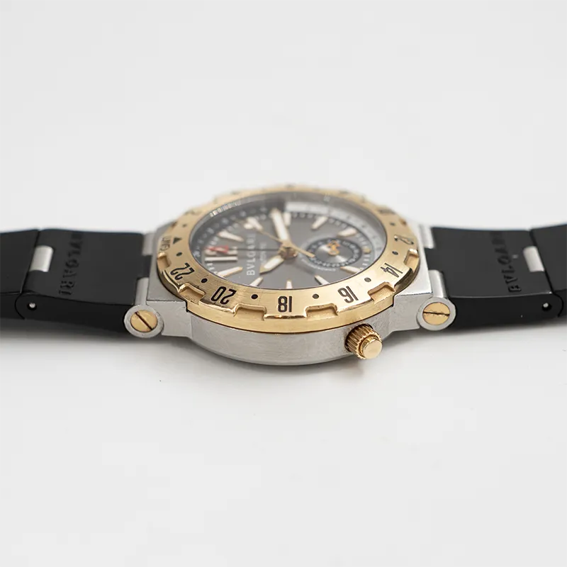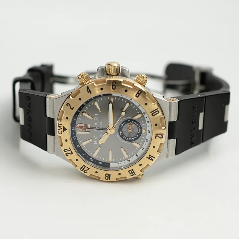 Til salgs tilbys en sporty og karakteristisk Bvlgari Bvlgari Diagono GMT GMT40SG-1. Modellen kombinerer italiensk design med sveitsisk urmakeri og har et distinkt og elegant uttrykk.