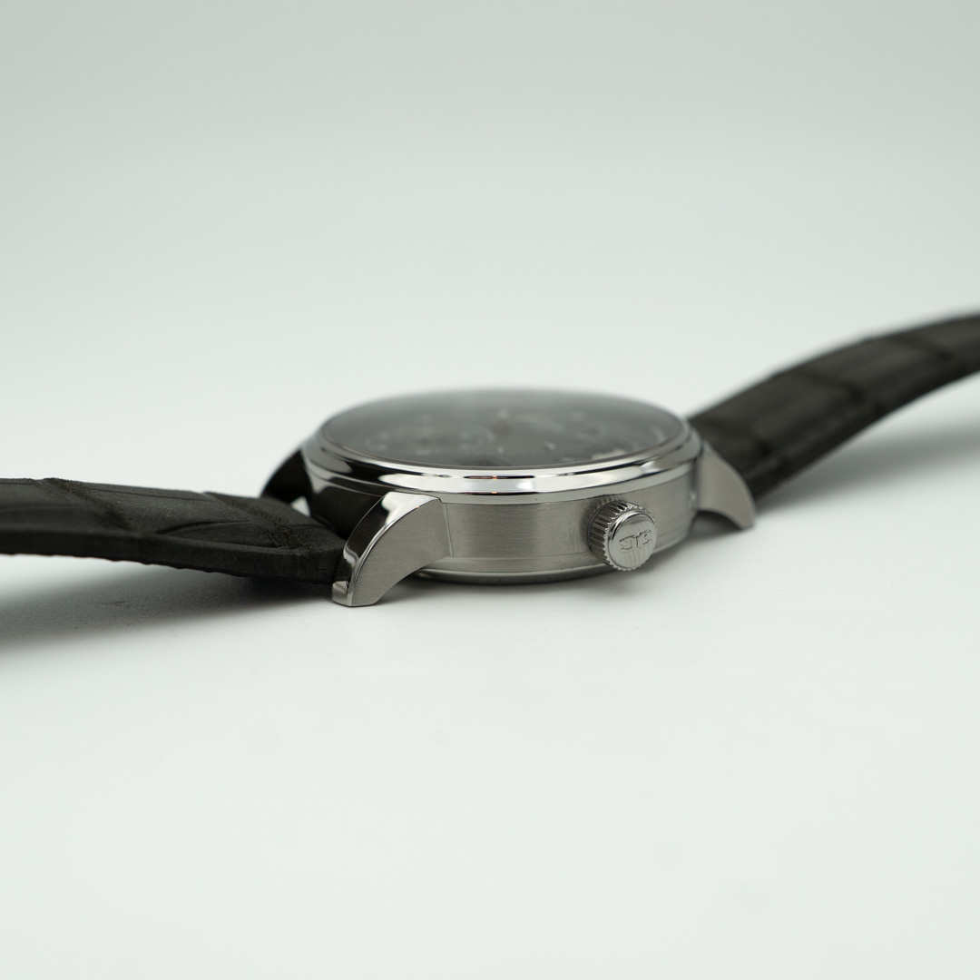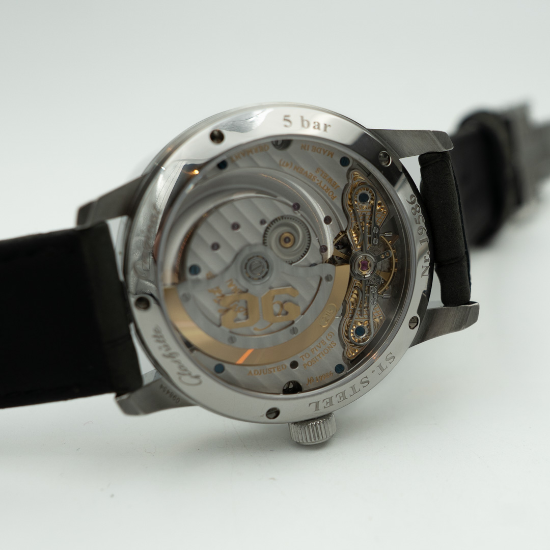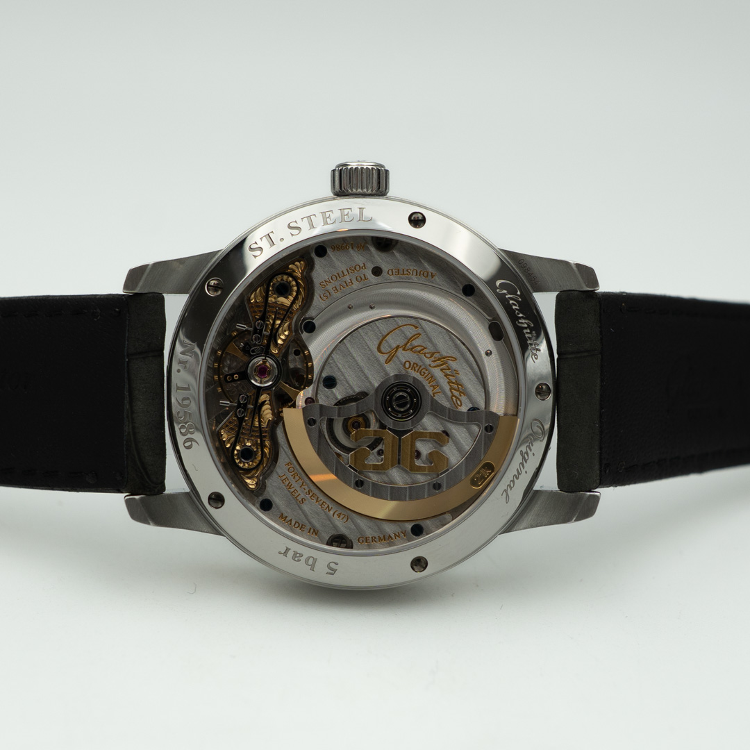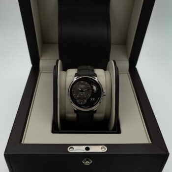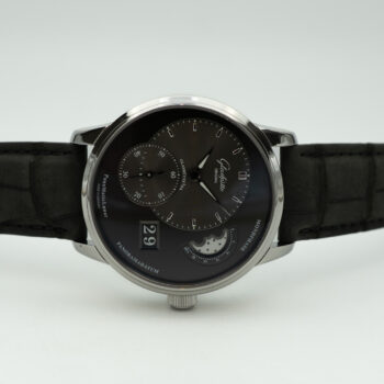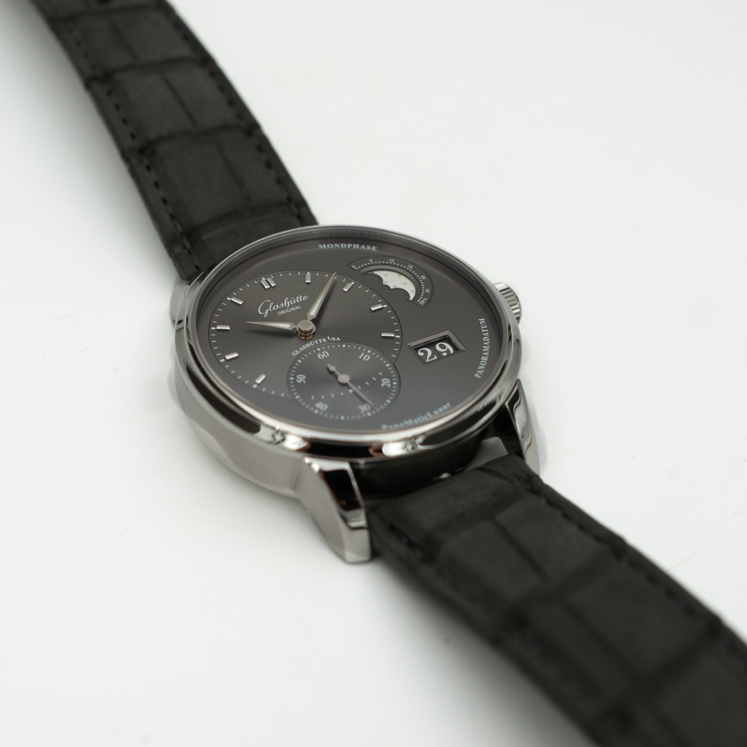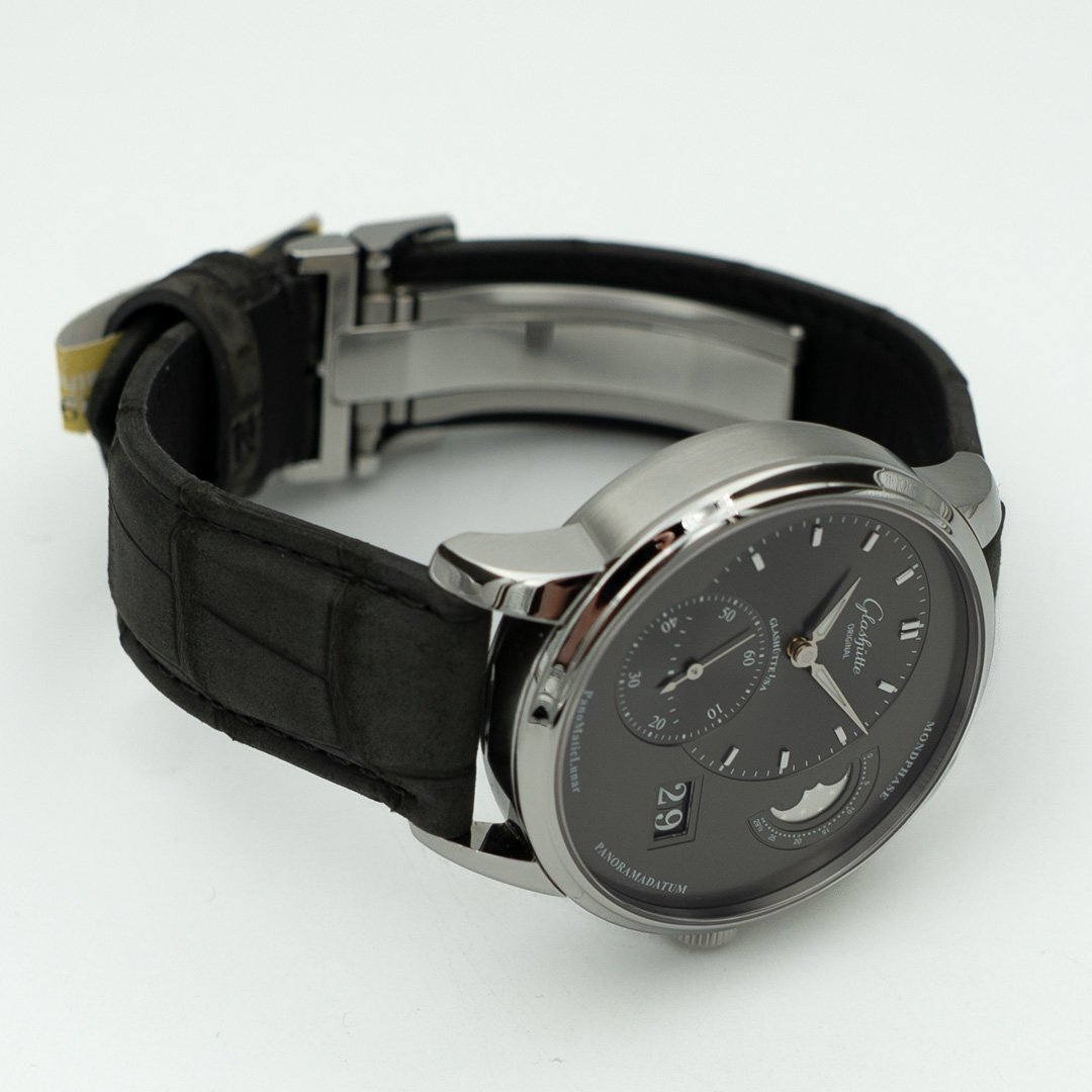 Glashütte Original PanoMaticLunar er et sofistikert armbåndsur som forener klassisk tysk urmakerkunst med moderne eleganse. Den karakteristiske asymmetriske urskiven, kombinert med panoramadato og månefasevisning, gir klokken et unikt og balansert uttrykk. Uret drives av et presist automatisk urverk, synlig gjennom safirglass på baksiden, og er utført i materialer av høy kvalitet. Et tidløst valg for den kvalitetsbevisste klokkeentusiasten.