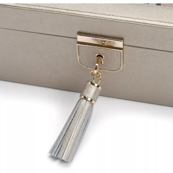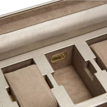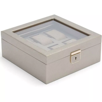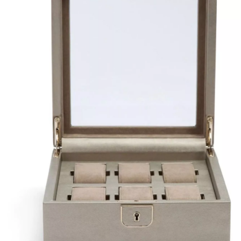 Klokkeboksen måler 22,25 cm i lengden, 23 cm i bredden og 9,5 cm i høyden, og rommer seks individuelle klokkeplasser med myke, hengende puter som holder hver klokke sikkert på plass uten å belaste rem eller lenke. Innsiden er nøye strukturert for å gi både oversikt og trygghet, og boksen lukkes med en lås og nøkkel, slik at klokkene dine oppbevares sikkert.