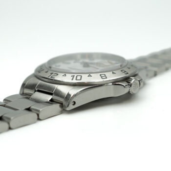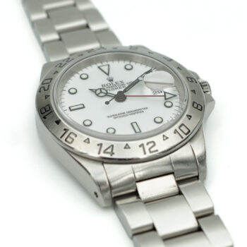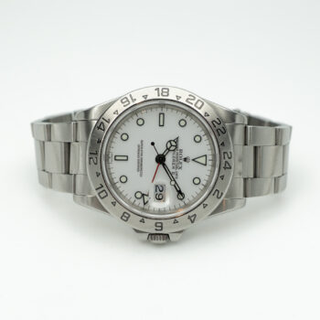 Tiåret var 1950, og kappløpet om å være først på de høyeste fjelltoppene var i full gang. Rolex, som en anerkjent produsent av hardføre klokker, var selvfølgelig med i kappløpet som tidtaker. Resultatet ble den første Rolex Explorer, som i dag er en av Rolex sine lengst produserte og mest ikoniske modeller. Kolleksjonen fikk senere en Explorer II, med GMT-funksjon og større kasse. Dette uret er kjøpt nytt i 1998 og er dermed den ettertraktede gamle versjonen av Rolex Explorer II. Uret er i god stand, og har hatt full overhaling hos Rolex i 2022. Uret kommer med boks, og diverse brosjyrer.