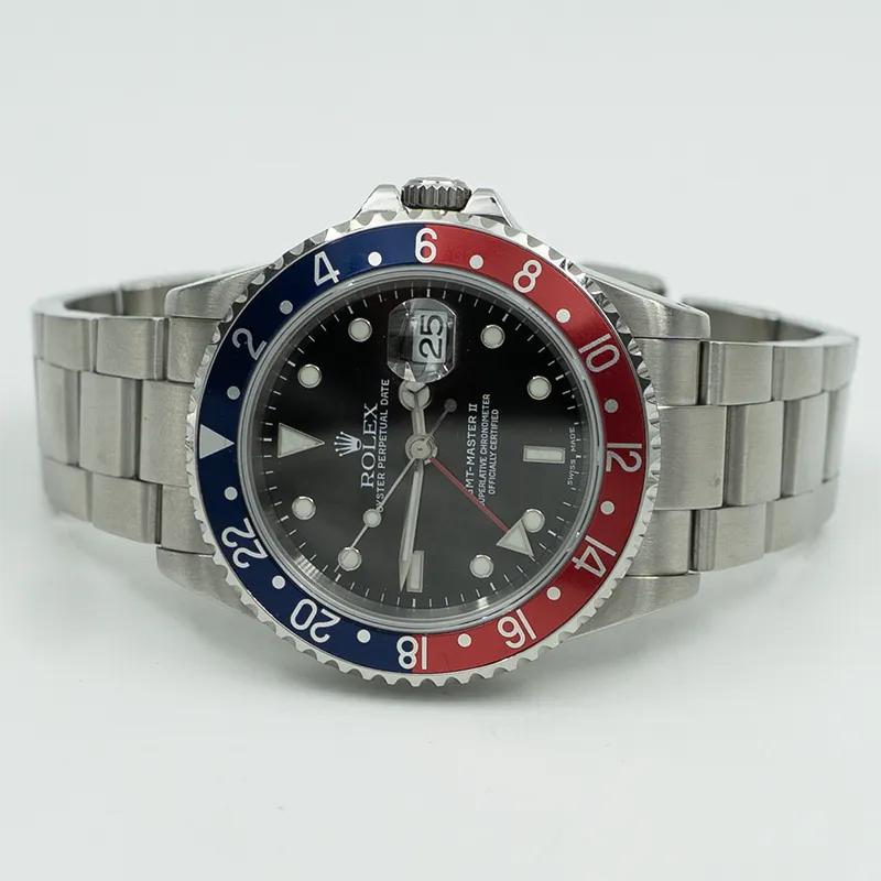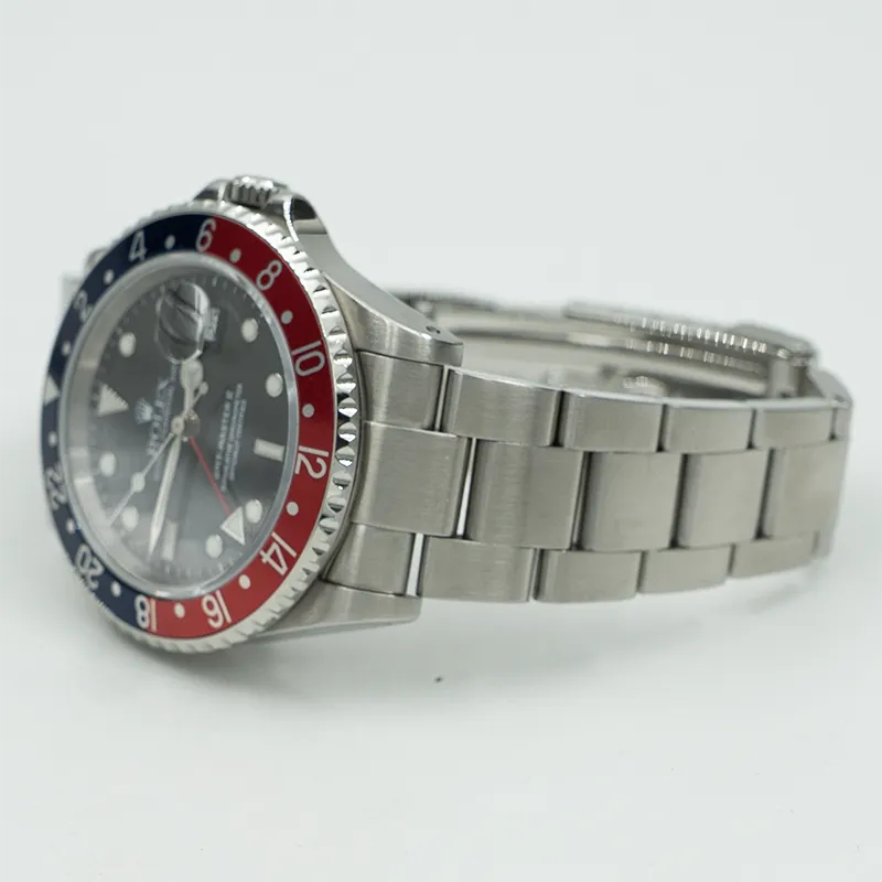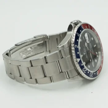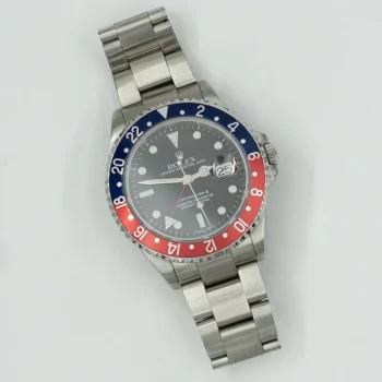 Klassisk og ikonisk GMT-modell fra Rolex, kjent som “Pepsi” på grunn av den karakteristiske røde og blå bezelringen. Denne klokken fra år 2000 fremstår i sjeldent god tilstand og representerer Rolex på sitt aller beste som verktøyklokke, med robust design og pålitelig ytelse.