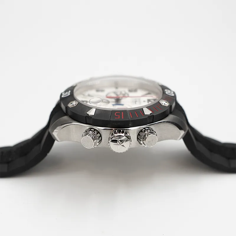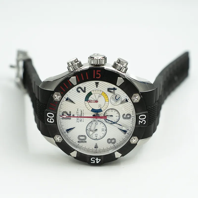 Modellen har et moderne og robust uttrykk med Zeniths karakteristiske finish og detaljerte skive, og oppleves som både sporty og elegant på håndleddet.